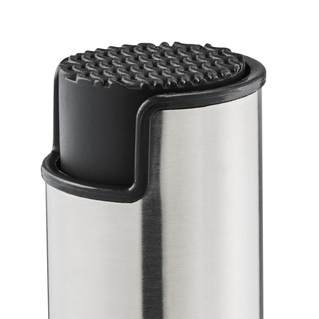 Stable yet flexible spray cover made from stainless steel and plastic: simply unscrew and remove for cleaning and topping up